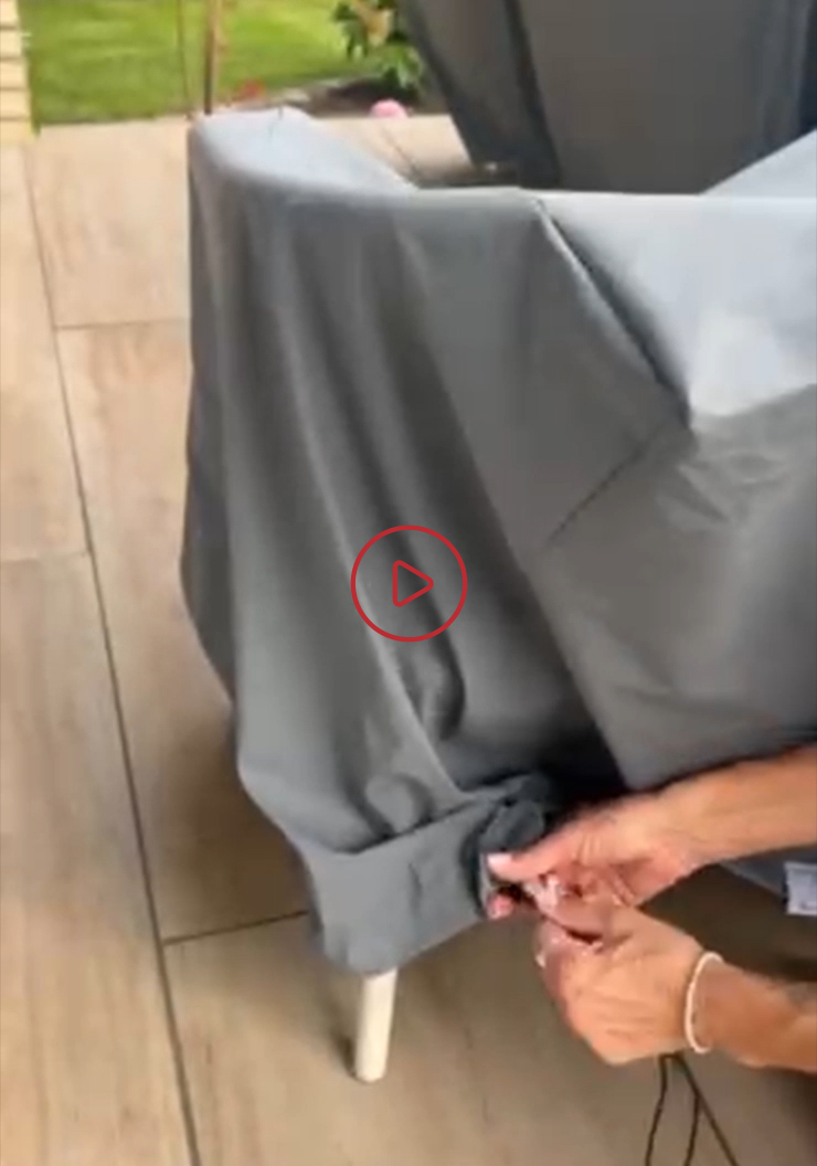 Es sind standardmäßig Gurte im Abstand von 25-30 cm in den Saum mit eingenäht. Darin ist eine schwarze Schnur eingefädelt, um die Abdeckhaube zuzuziehen. Unter „Zubehör“ findet man weitere Befestigungsmöglichkeiten, wie z.B. einen Gurt mit Clip (um z.B. quer unter der Tischplatte die Abdeckung zu befestigen) oder Gummiseile in diversen Längen inkl. einer sogenannten Olive um die Abdeckung um den Tischfuß zu befestigen (wenn diese außen und bündig mit der Tischkante sind) oder um ein Gummiseil einmal rundherum um die Abdeckung zu spannen.