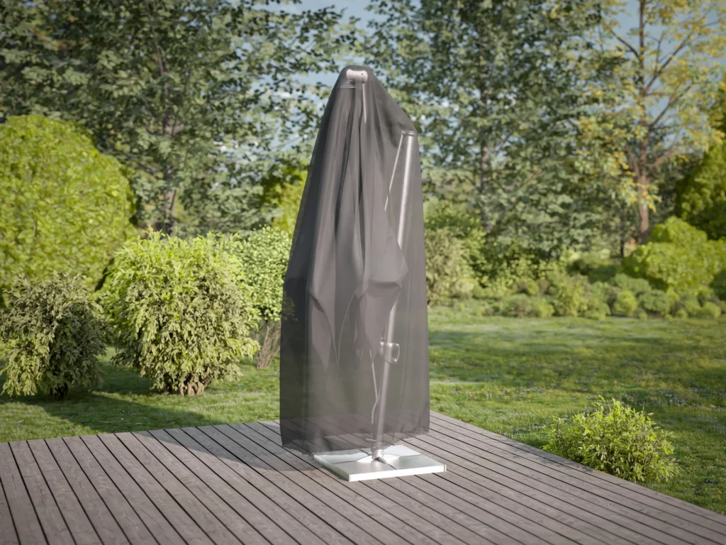 - Bei den Cover Me-Schirmabdeckungen sind unten rundherum Gurte eingenäht. Ein Gurt mit Clip ist in den Gurten eingefädelt. Damit kann die Abdeckung unten herum gespannt werden.